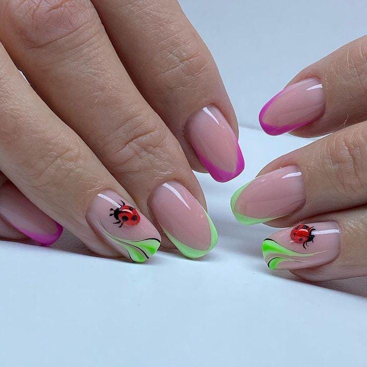 Featuring bold pink and green French tips with flowing wave-like accents. The ladybugs bring in a playful detail, balancing elegance with a fun, lively vibe.