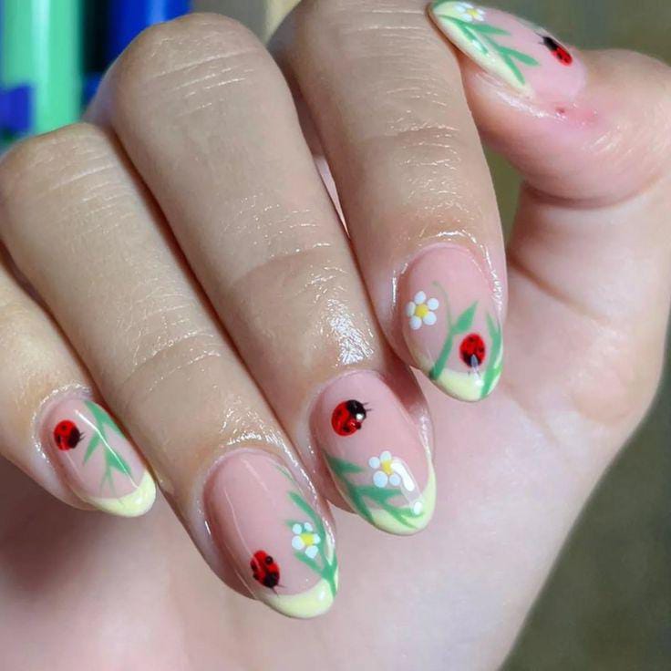 This design pairs soft yellow tips with delicate white daisies, green leafy strokes, and scattered ladybugs. The look is sweet and outdoorsy, the evoking feeling.