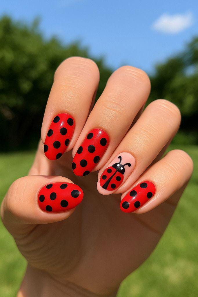 This design keeps it simple yet striking with bright red nails covered in bold black polka dots, and a ladybug on finger nail.