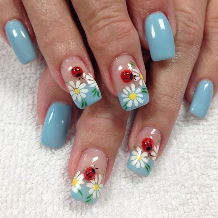 Soft sky blue nails paired with hand-painted daisies and tiny red ladybugs create a fresh, springtime vibe. The mix of floral patterns and little insects brings a cheerful, outdoorsy feel to the design.