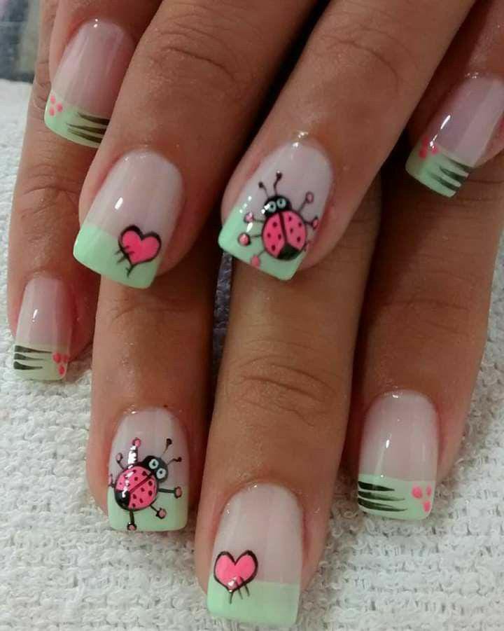 Featuring soft green French tips, this set is decorated with cartoon-style ladybugs and pink hearts for a sweet, romantic twist.