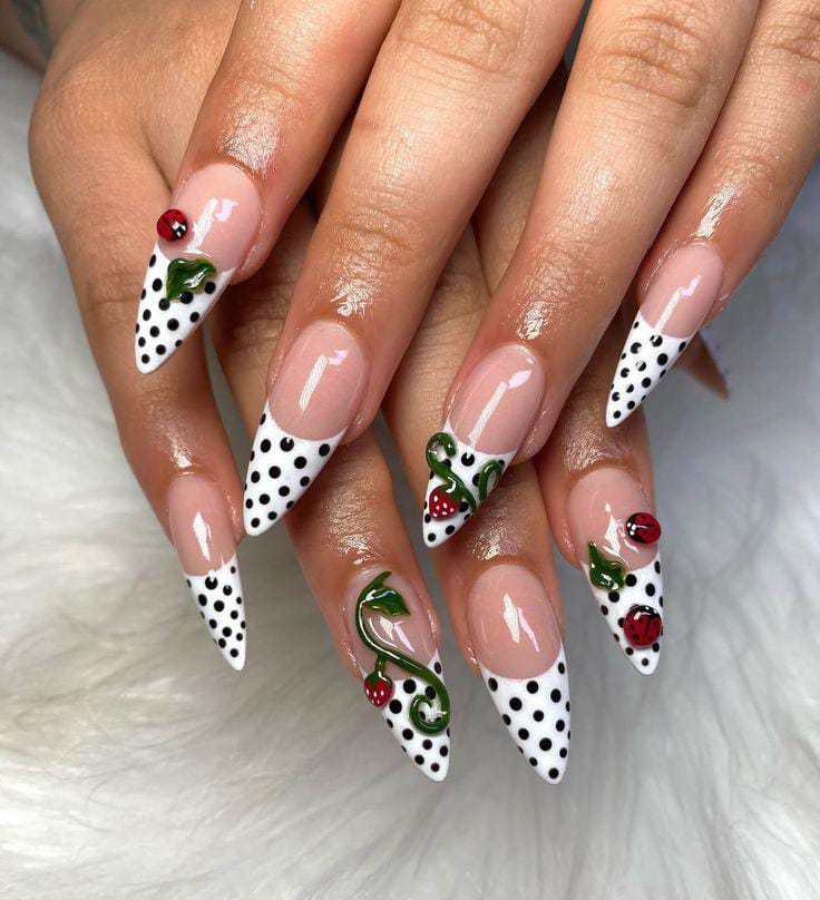 Glossy black French tips decorated with crisp white polka dots create a chic nighttime feel, while little ladybugs add a playful and unexpected twist.