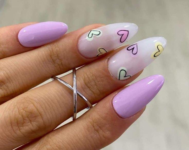 Soft lavender nails paired with tiny pastel heart outline designs on sheer bases give a sweet, airy Valentine vibe. The look feels playful, light, and effortlessly romantic.