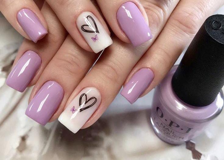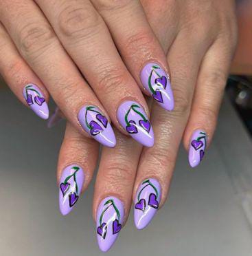 Heart shapes on lavender nails are decorated with leafy outlines. The look is romantic with a slight artistic Valentine’s touch.