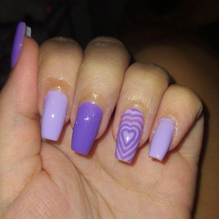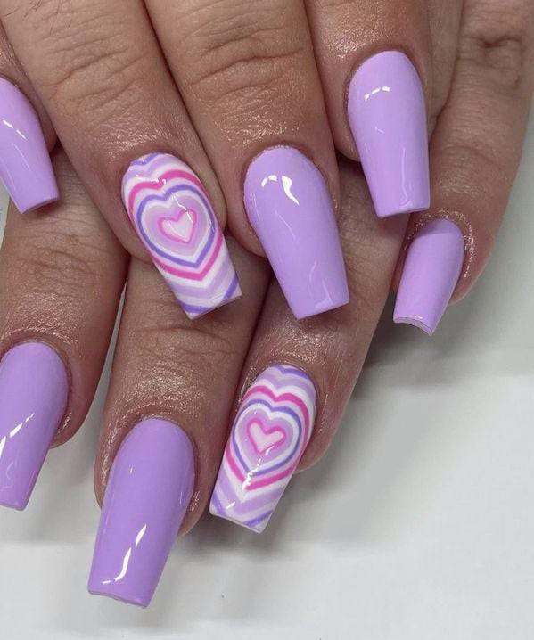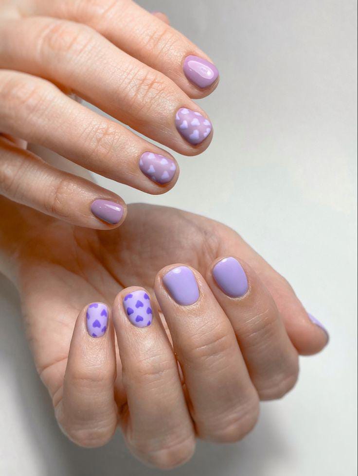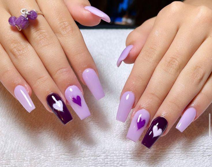 This design features soft lavender and deep purple nails with glossy heart accents. The bold contrast gives it a playful yet romantic Valentine vibe.