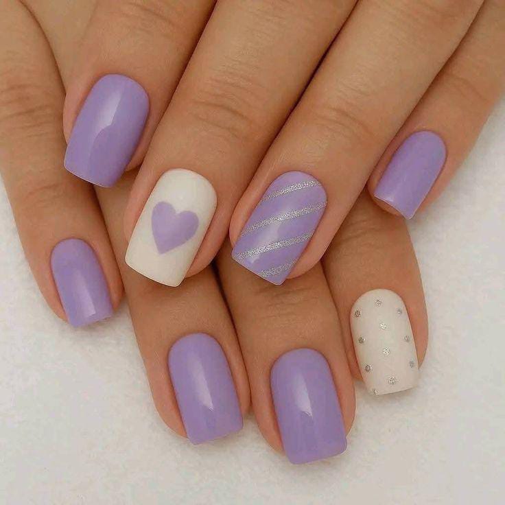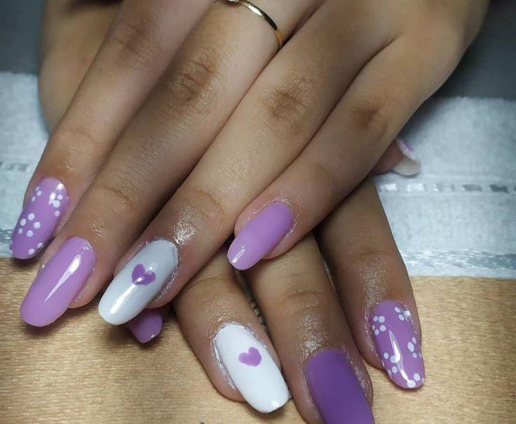 This design blends solid lavender nails with creamy white accents, subtle stripes, dots and heart details. It has a sweet, minimal Valentine feel with a polished finish.