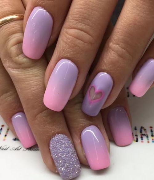 A smooth lavender-to-pink ombré creates a soft dreamy base with delicate cady like glitter and heart accents. The overall vibe is romantic, gentle, and effortlessly feminine Valentines.