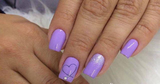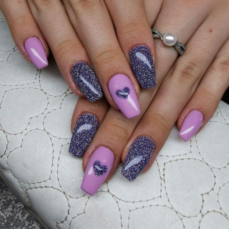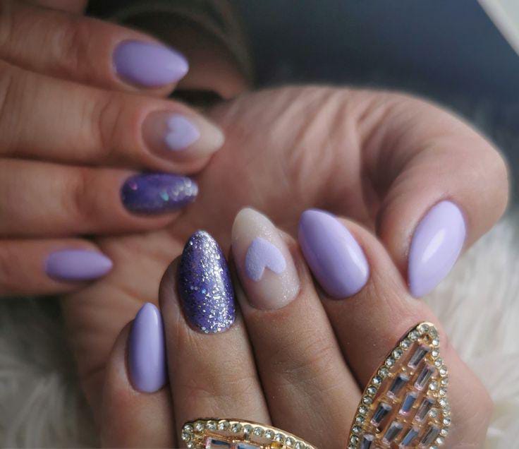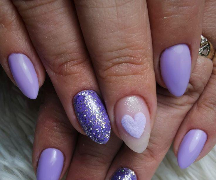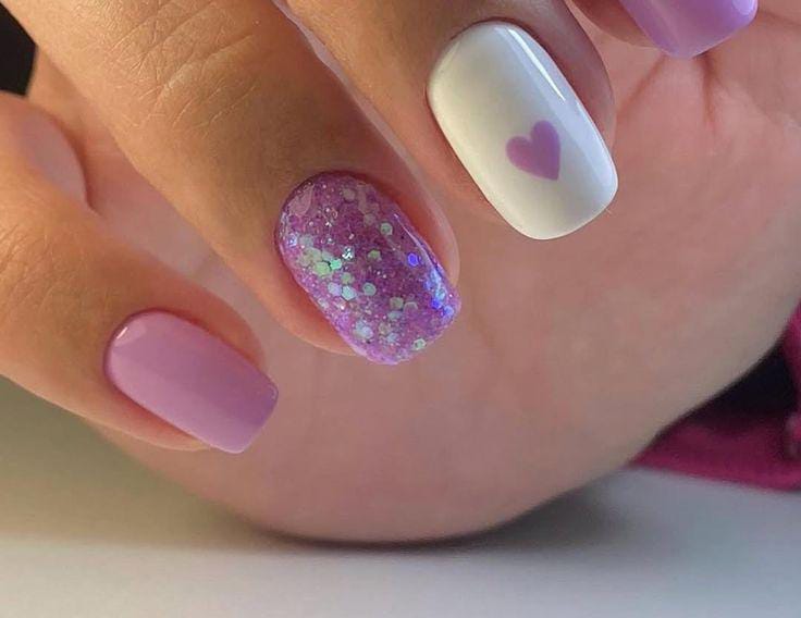 Lavender tones are mixed with a glittery accent nail and a soft heart detail. The look feels festive, feminine, and perfect for special Valentine moments.