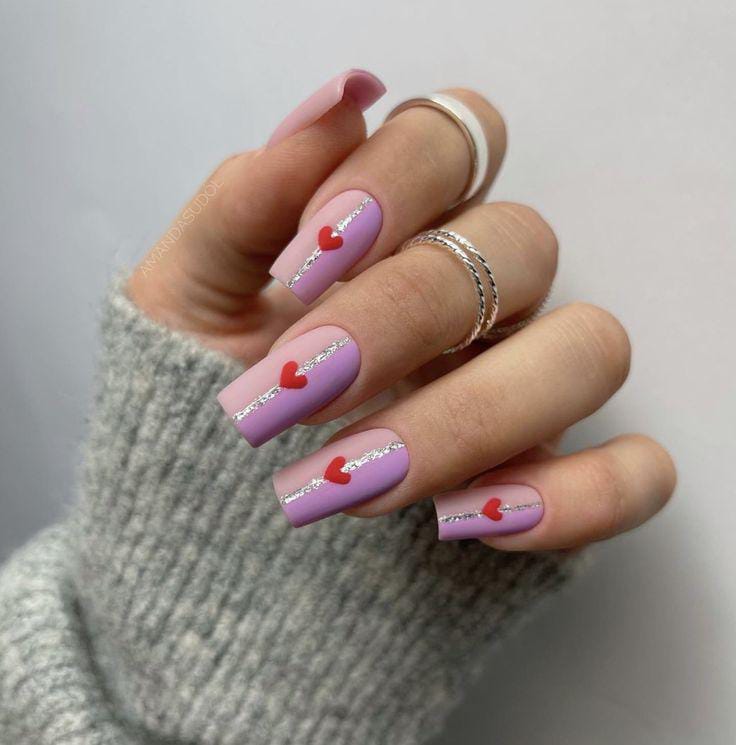 A lavender and pink matte base paired with red hearts and thin silver lines gives an elegant and modern feel. This design looks well-balanced and classy for Valentine’s Day.