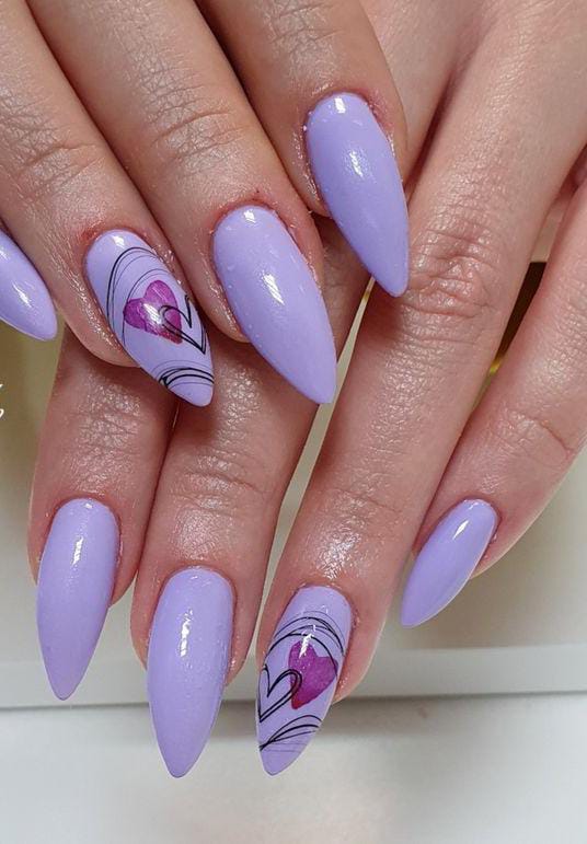 Abstract black lines and heart art on plain lavender nails makes this design stylish and trendy. The vibe feels soft, feminine, and modern Valentine’s finish.