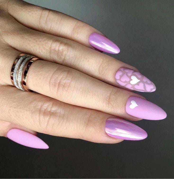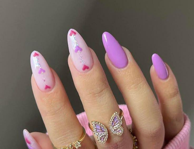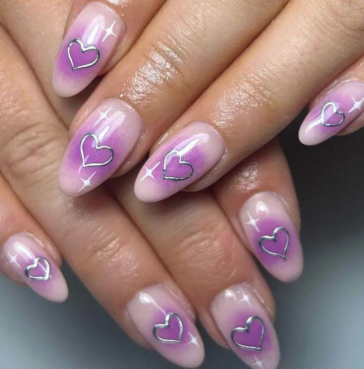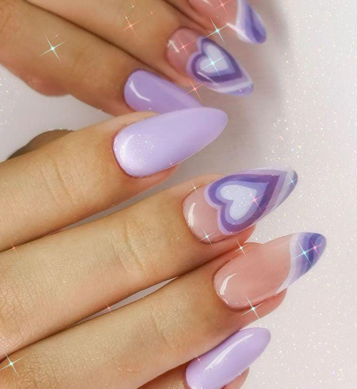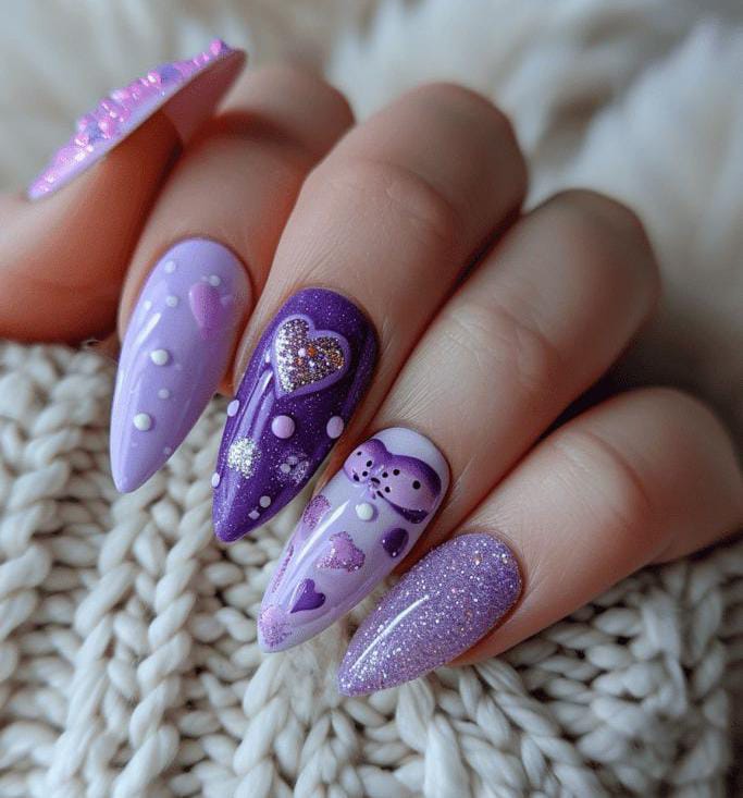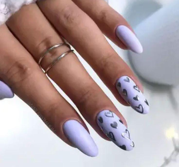 Lavender tones are paired with heart accents and a touch of glitter for a polished Valentine style. The overall vibe is elegant, romantic, and slightly glamorous without being overdone.