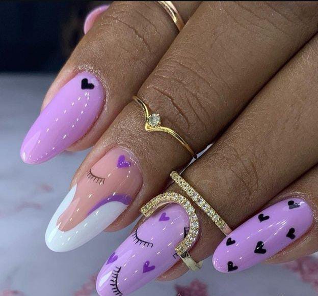 Lavender tones, soft blush with white tip details and tiny black heart art. The look is cozy, feminine, and perfect for Valentine season.