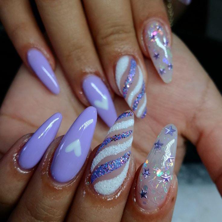 Lavender nails are enhanced with flowing glitter swirls and simple heart, tiny star patterns. The design feels dreamy, artistic, and slightly magical Valentines look.
