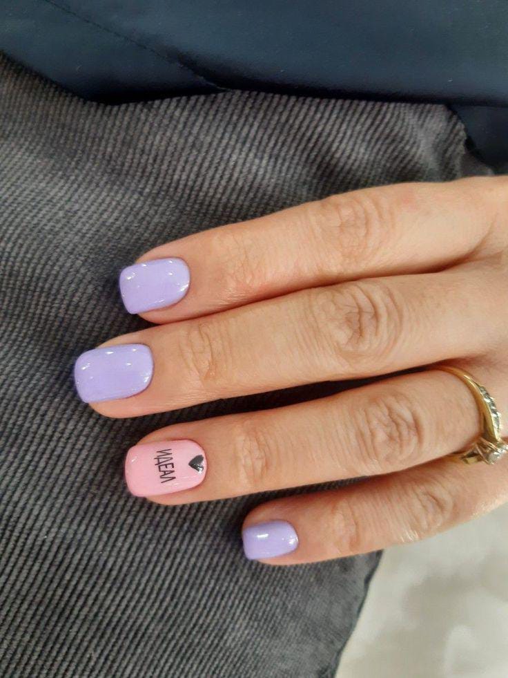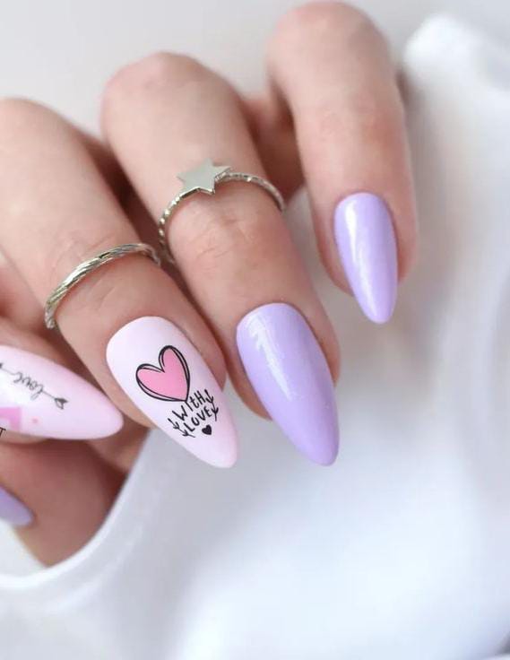 Light lavender and soft pink nails are paired with a playful heart and handwritten-style and lettering detail. The look feels fun, youthful, and slightly flirty Valentine’s feel.