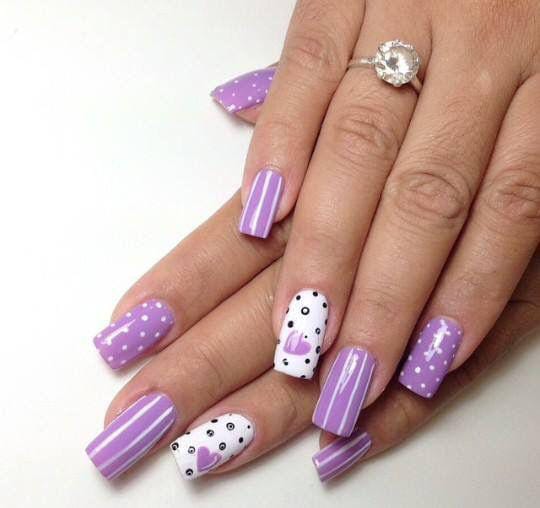 Lavender nails are mixed with white accent nails featuring dots, lines and tiny heart designs. The overall look is cute, cheerful, and perfect for a playful Valentine theme.
