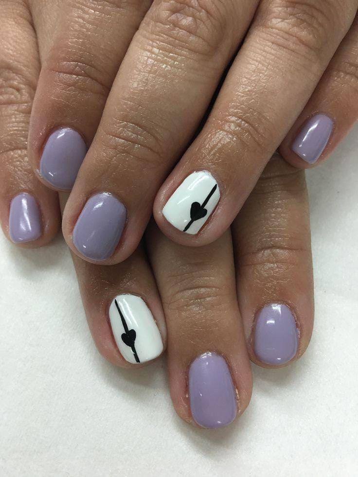 Muted lavender nails are paired with clean white accents and thin black heart lines. The overall look is simple, modern, and quietly romantic Valentines.