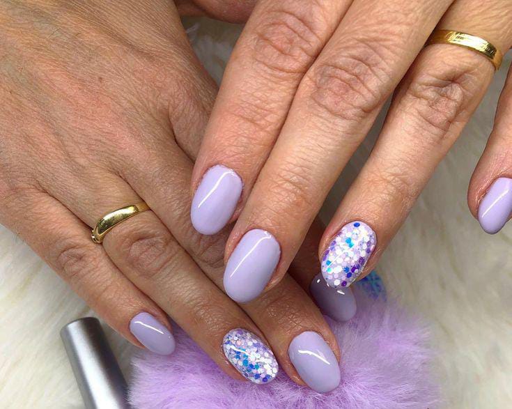 Classic lavender nails are mixed with subtle glitter accents for added sparkle. The style feels polished with a touch of festive romance Valentines.