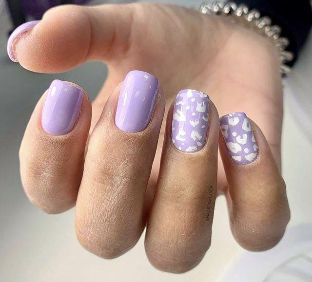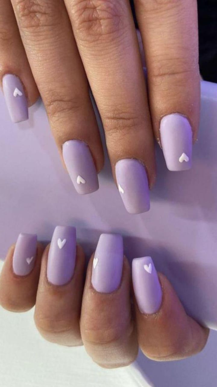 Matte lavender nails are decorated with tiny white heart details. The style is cute, delicate, and very Valentine-inspired.