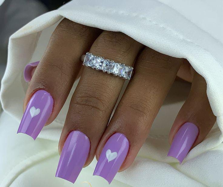 Soft lavender nails with a glossy finish are paired with tiny white heart accents for a clean, romantic look. The overall vibe feels simple, sweet, and perfect for Valentine’s Day.
