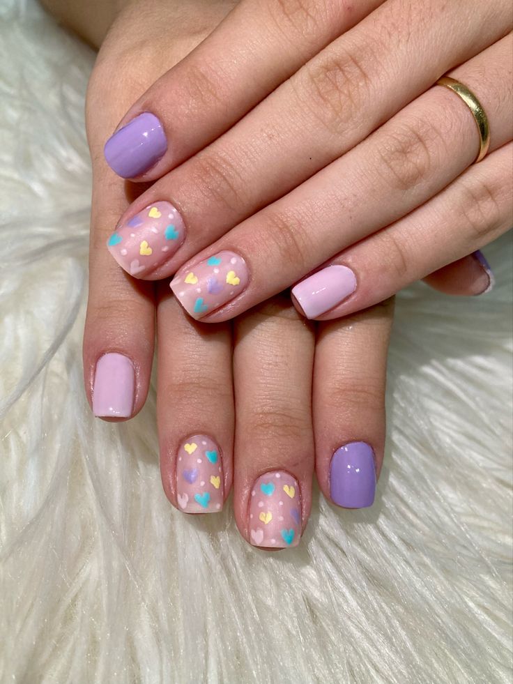 Lavender nails are paired with white accent nails decorated with colorful candy-style hearts. The design feels cheerful, youthful, and full of Valentine charm.