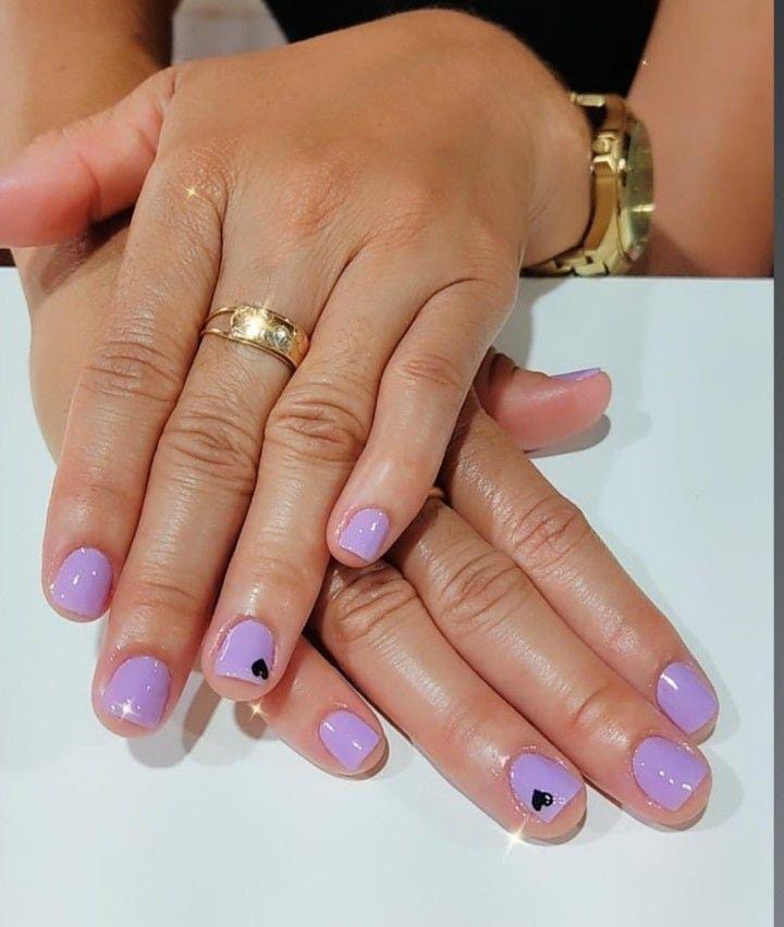 Solid lavender nails are finished with tiny black heart accents for a simple yet romantic Valentine’s touch. This design is elegant, timeless, and easy to style.
