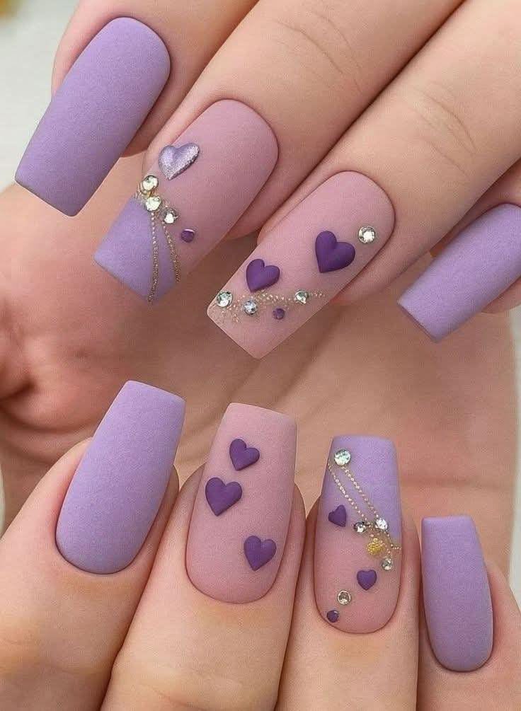 This design mixes matte lavender and mauve tones with raised heart accents and subtle rhinestones. The overall vibe feels romantic, elegant, and slightly Valentines glam without being too bold.