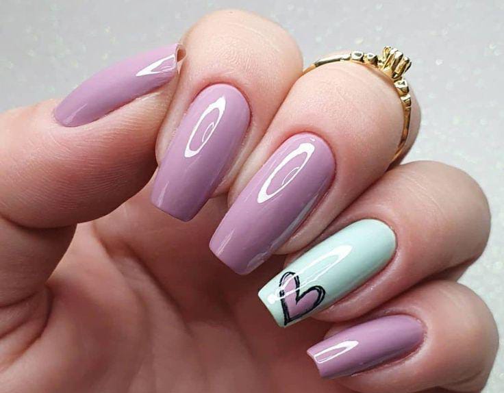 Glossy lavender nails are balanced with a mint accent nail featuring a delicate lavender heart with black outline. The look is soft, fresh, and effortlessly romantic Valentine’s look.