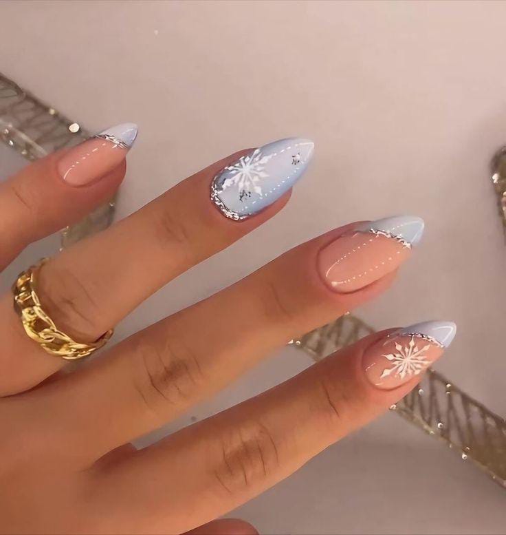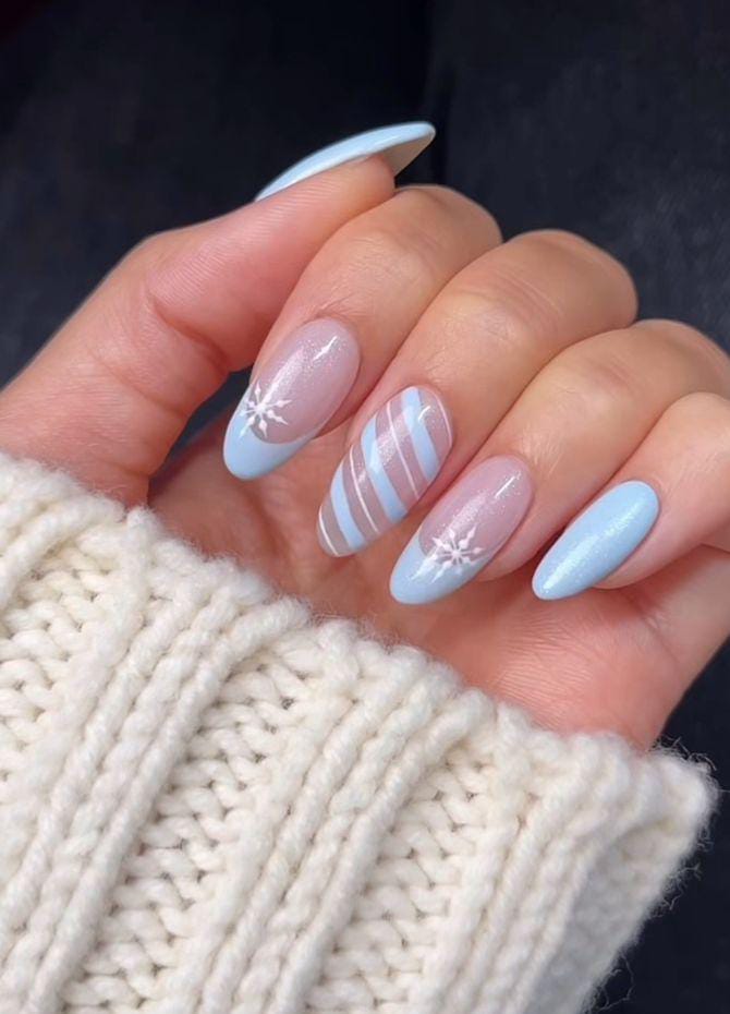 This design combines a soft pastel blue with sheer nude accents, topped with delicate white snowflakes that create a clean, wintry look. It feels airy and minimal, perfect for a subtle seasonal manicure.