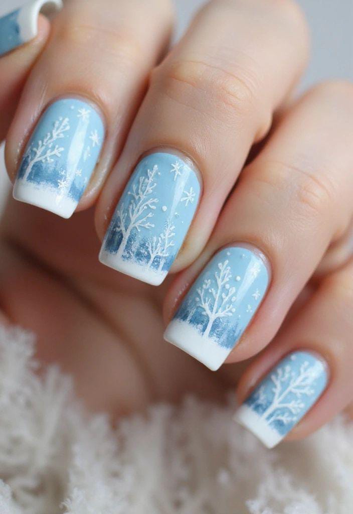 A smooth baby-blue ombre fades from the tips into a neutral nude, highlighted with thin white lines and subtle snow-like splatters for a clean, airy winter vibe.