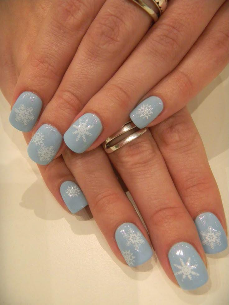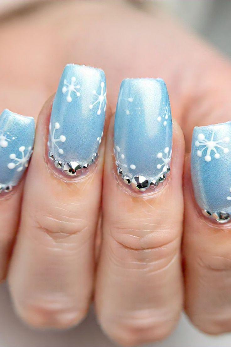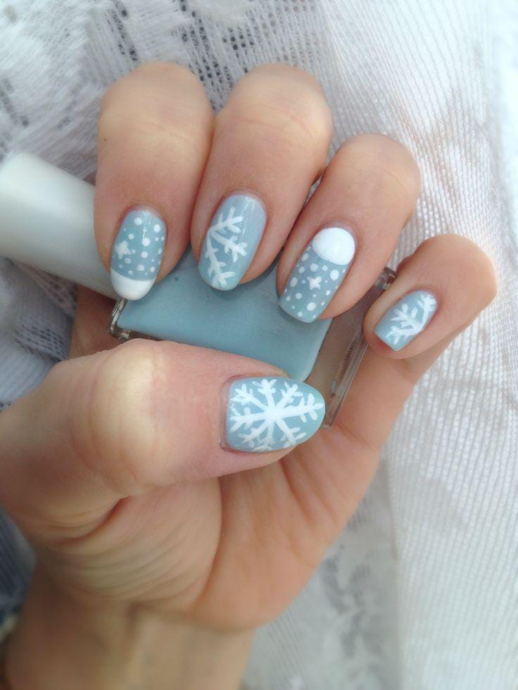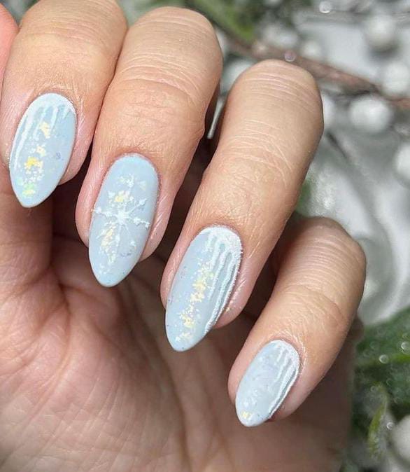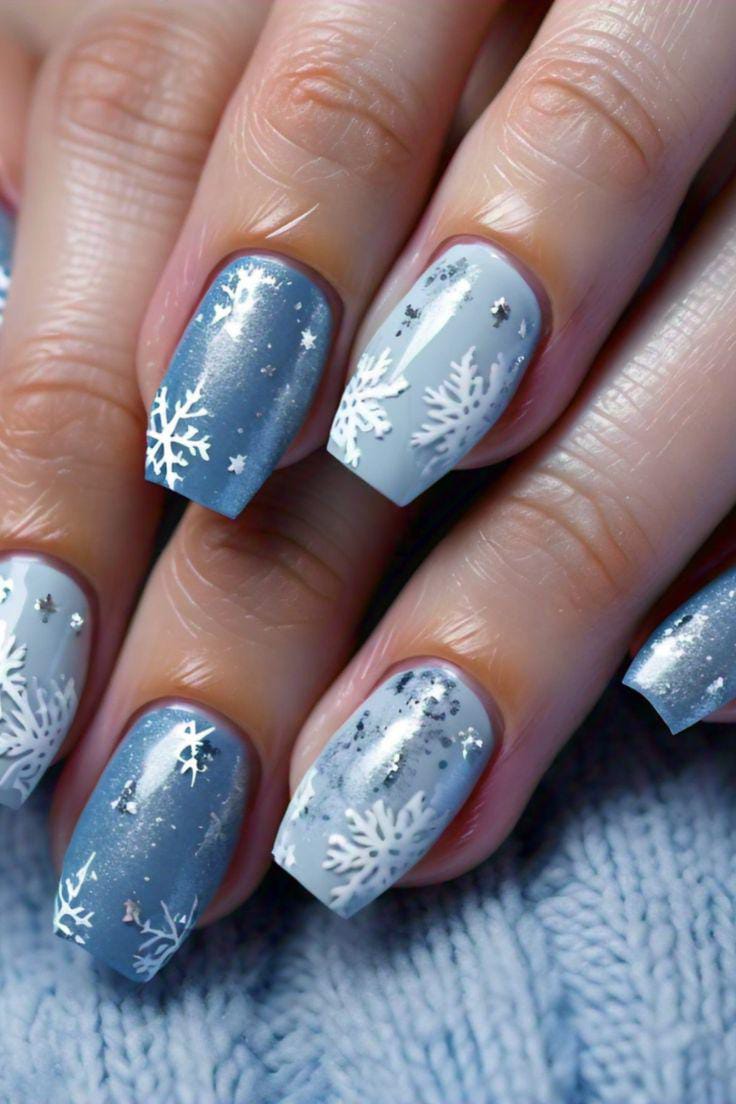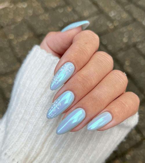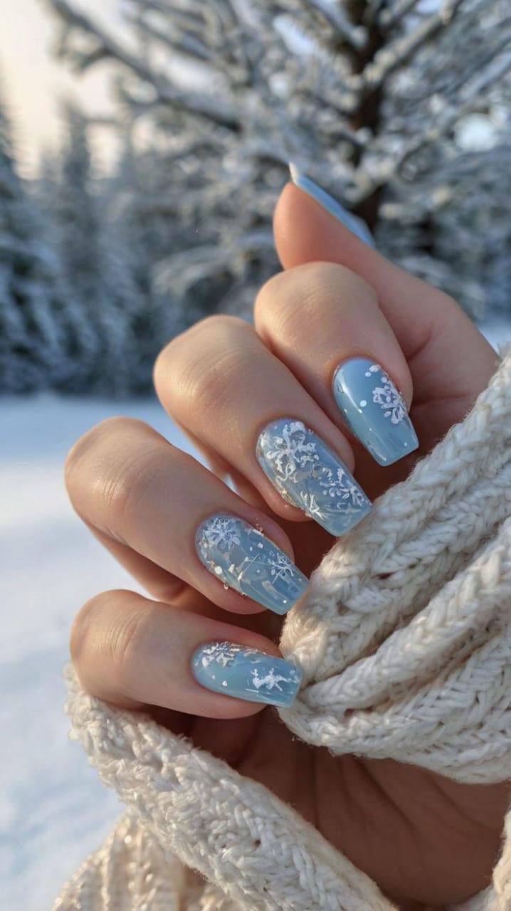 A soft icy blue base with a pearly sheen is decorated with delicate white snowflakes and dotted accents, creating a crisp, wintery look that feels both elegant and festive.