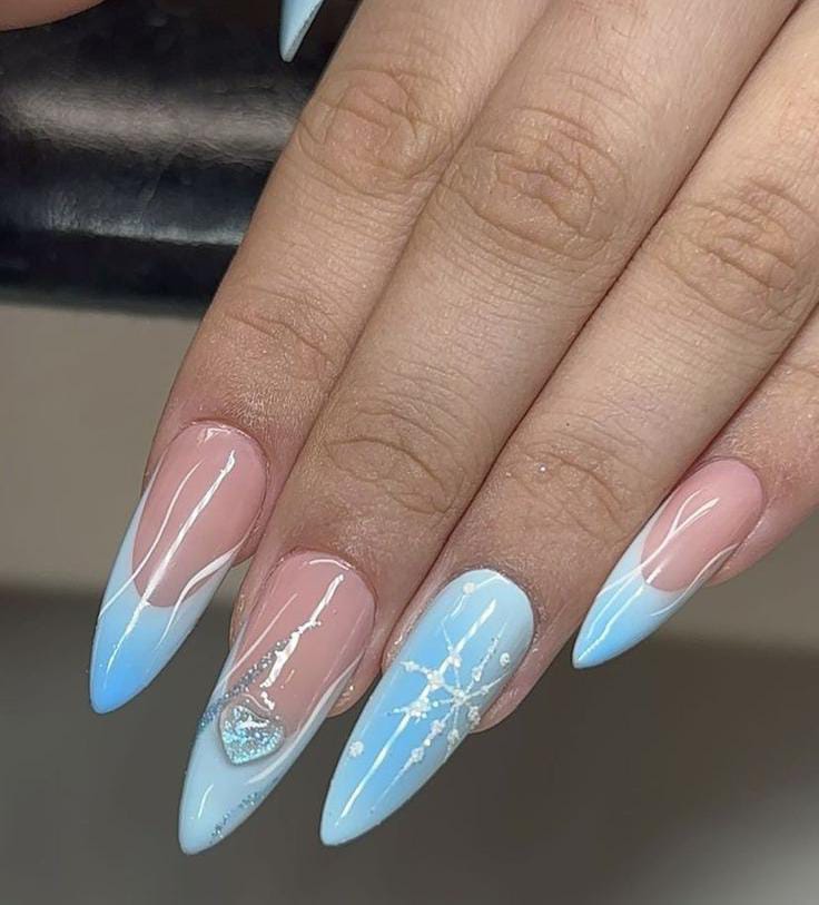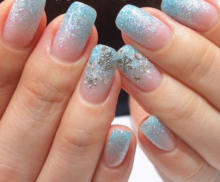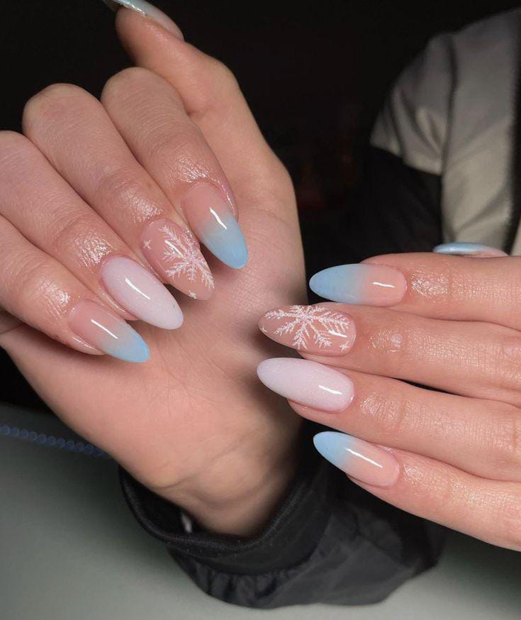 These nails fade from natural nude to a light blue, sprinkled with soft glitter and simple white snowflakes. The gradient gives a graceful, frosted look perfect for elegant winter styles.