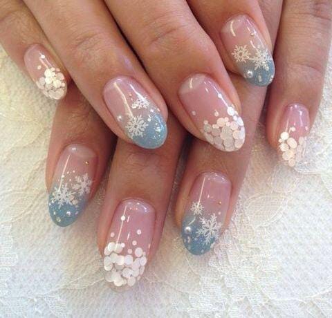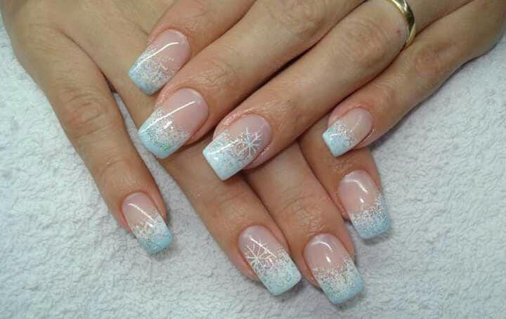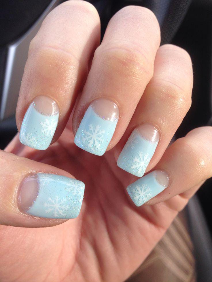 Soft light-blue French tips fade into a milky base, decorated with delicate white snowflakes and subtle shimmer, giving the nails a frosty winter glow.
