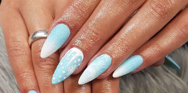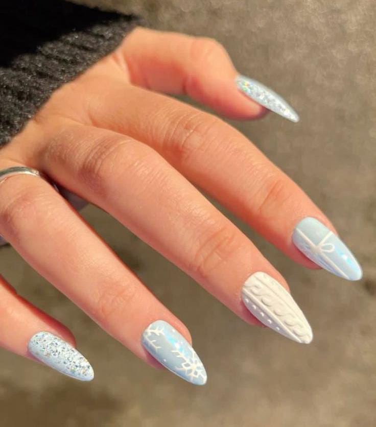 Almond nails in icy blue pair glitter, snowflake art, and sweater-knit textures with ribbon-style accents, resembling wrapped holiday gifts in winter hues.