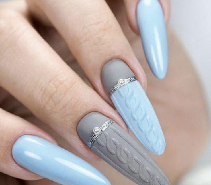 Matte pastel blue and grey nails feature raised sweater-knit patterns and tiny pearl accents, mixing winter comfort with chic, sophisticated style.