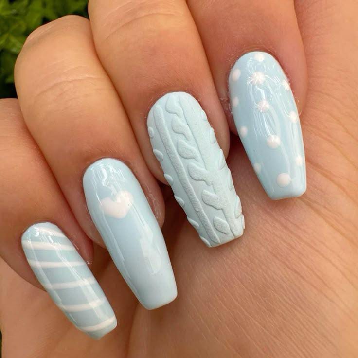 Creamy light blue nails combine glossy and textured finishes with knit details, dots, and simple line art, creating a cozy and playful winter look.