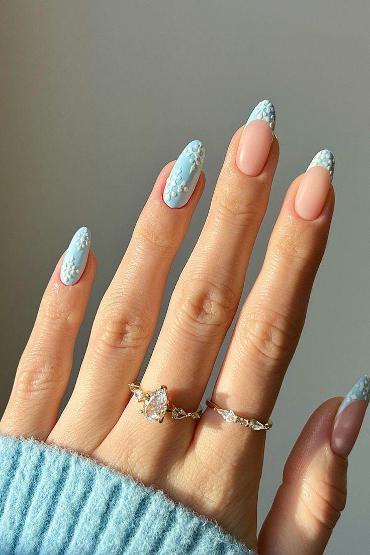 A soft nude base blends into light blue tips, adorned with delicate raised white floral accents that give the nails a cozy, textured winter feel.
