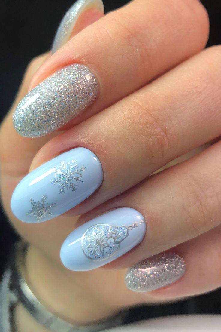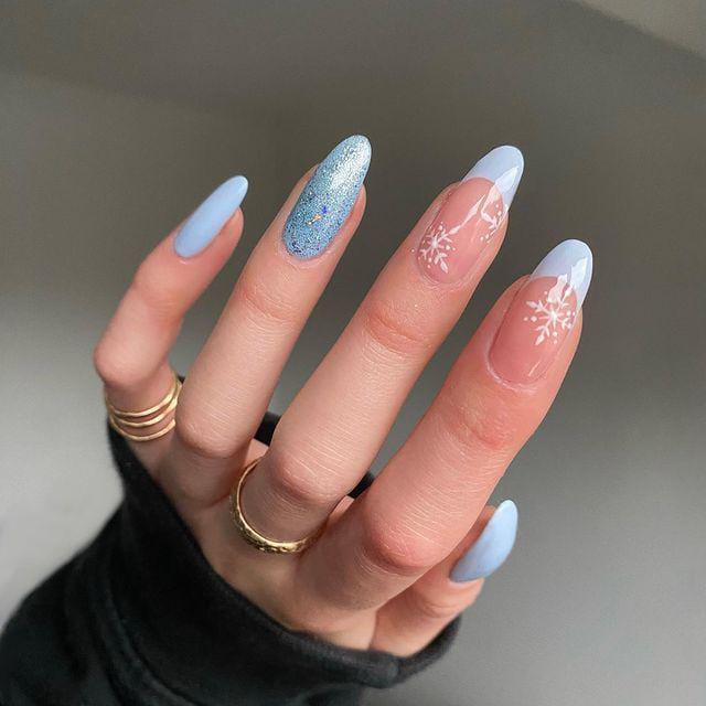 This look balances pale light blue nails with subtle silver snowflakes and high-shine glitter accents, creating a clean, polished winter style. The glitter nails add just the right amount of holiday sparkle.