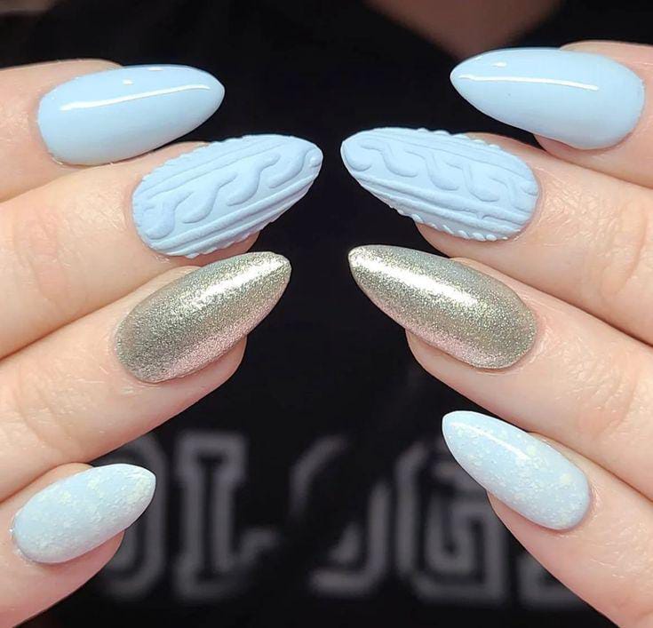 Soft light-blue nails mixed with matte, cable-knit textured accents give a cozy, sweater-inspired winter feel, elevated by shimmering champagne-silver nails that add a touch of glamour.