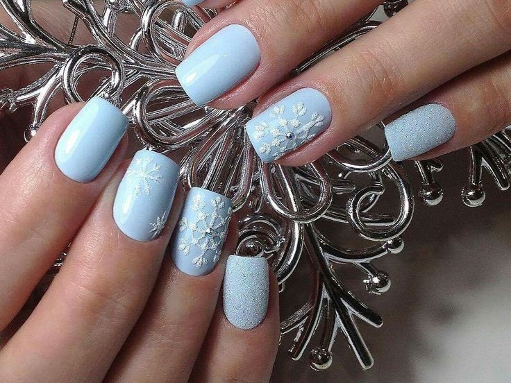 Matte and glossy light blues are paired with metallic silver accents and leaf-like patterns, bringing a polished and festive winter sparkle.