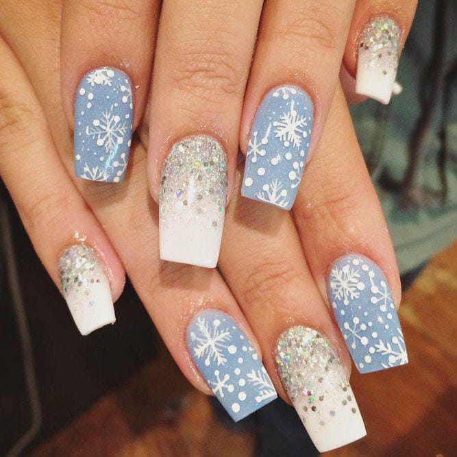 Gradient nails fade from light blue into crisp white, topped with glitter and snowflake patterns for a bold, snowy-day aesthetic full of seasonal winter sparkle.