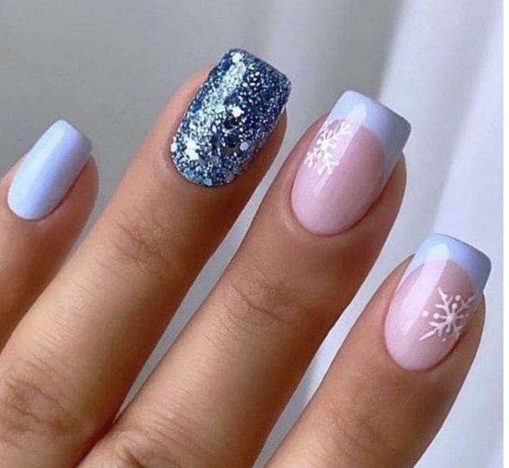 This design features sheer pink nails with light blue glitter tips, accented by delicate white snowflakes for a soft wintery sparkle. It’s playful and frosty without being overly bold.