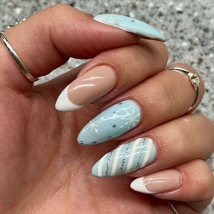 Featuring a mix of almond shapes, pale light blue snowflakes, glittery stripes, and classic white French tips, this set blends winter charm with a hint of festive candy-cane flair.