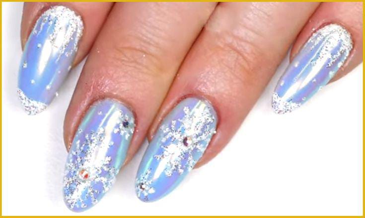 A sleek chrome-like light blue base is accented with silver glitter and intricate snowflakes, giving the nails a cool, wintery glow. This design has a bold, festive feel without being overly dramatic.