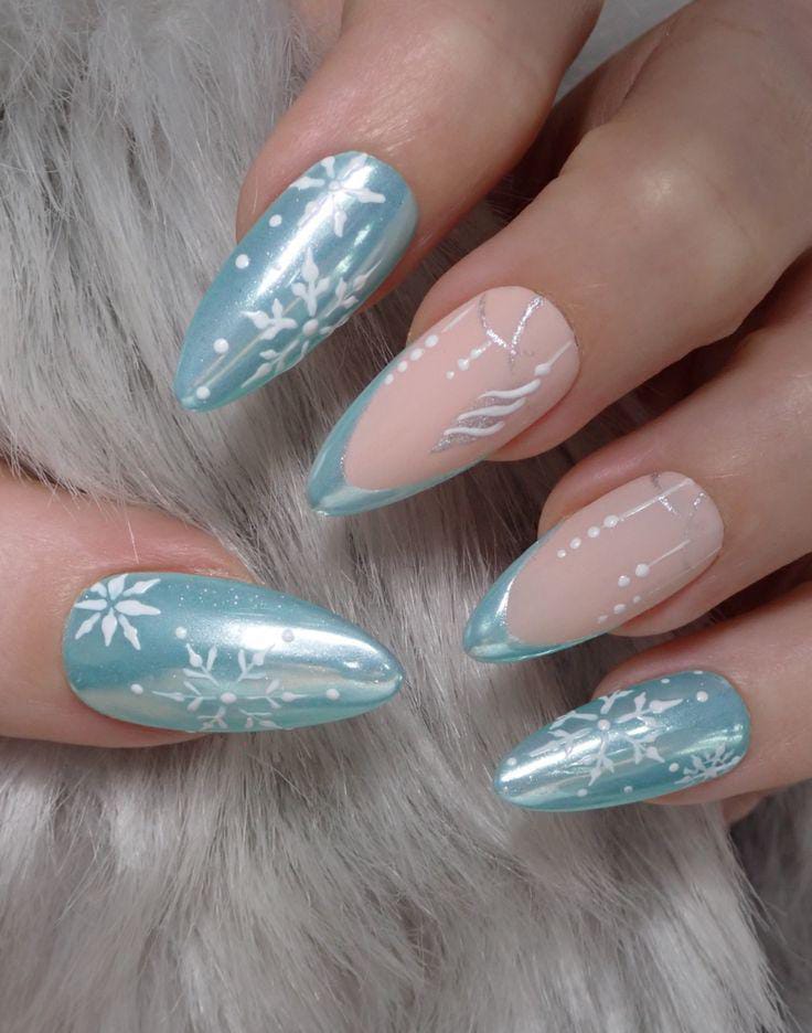 A mix of glossy pale light blue and sheer, glimmering pink nails decorated with simple snowflakes and tiny white dots gives off a frosty, lightweight winter vibe.