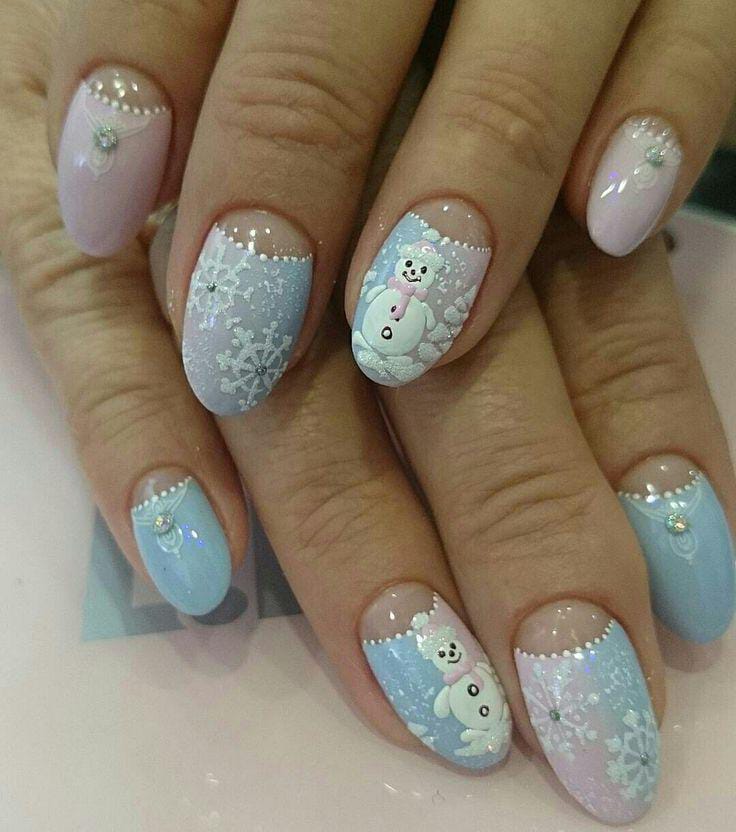 Pastel light blue and lilac nails decorated with glittery snowflakes and cheerful snowman characters give this set a playful, cozy winter vibe.