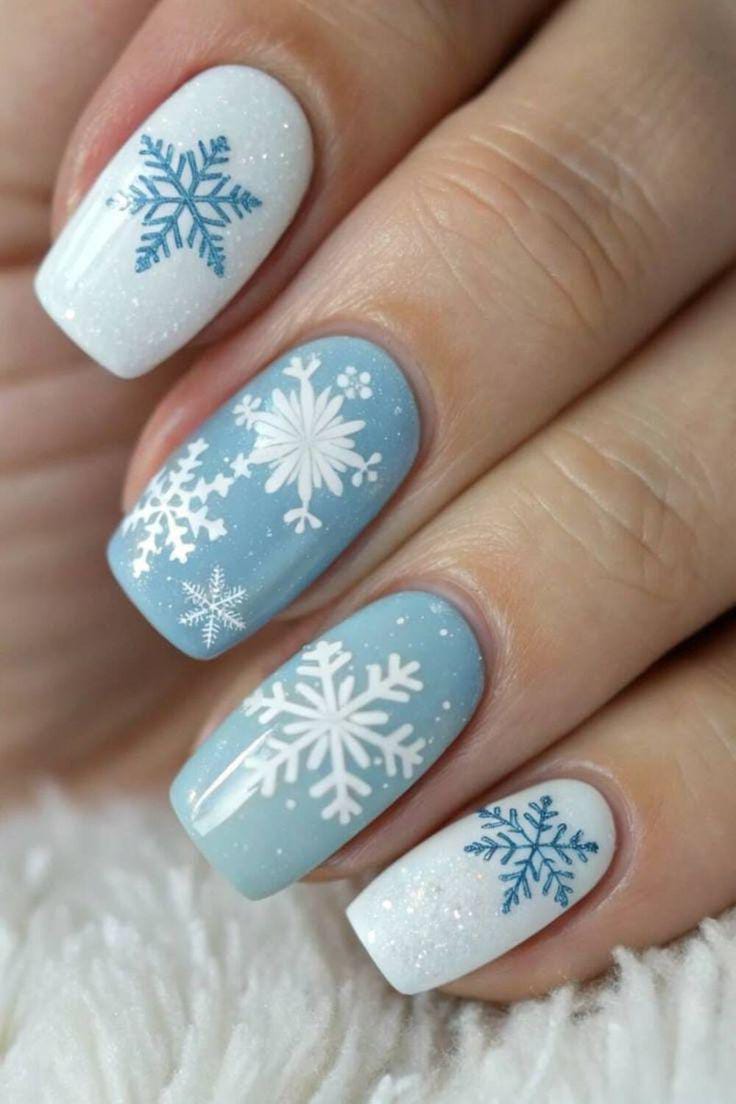 Soft baby-blue nails blend with crisp white tips, each adorned with bold snowflake patterns. The look is simple, festive, and timeless—perfect for anyone who loves a traditional winter theme.