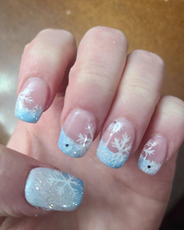 Light blue polish meets iridescent glitter near the cuticle, transitioning into calming winter tones with crisp white snowflake art. The look feels fresh, sparkly, and cheerful for colder months.