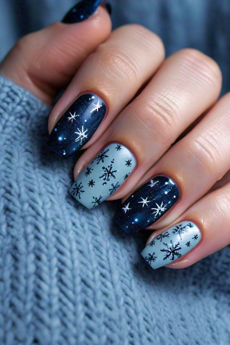 Deep navy nails with scattered white stars pair beautifully with light blue nails covered in snowflake patterns. The contrast feels dreamy and dramatic, like a clear winter night full of snowfall.