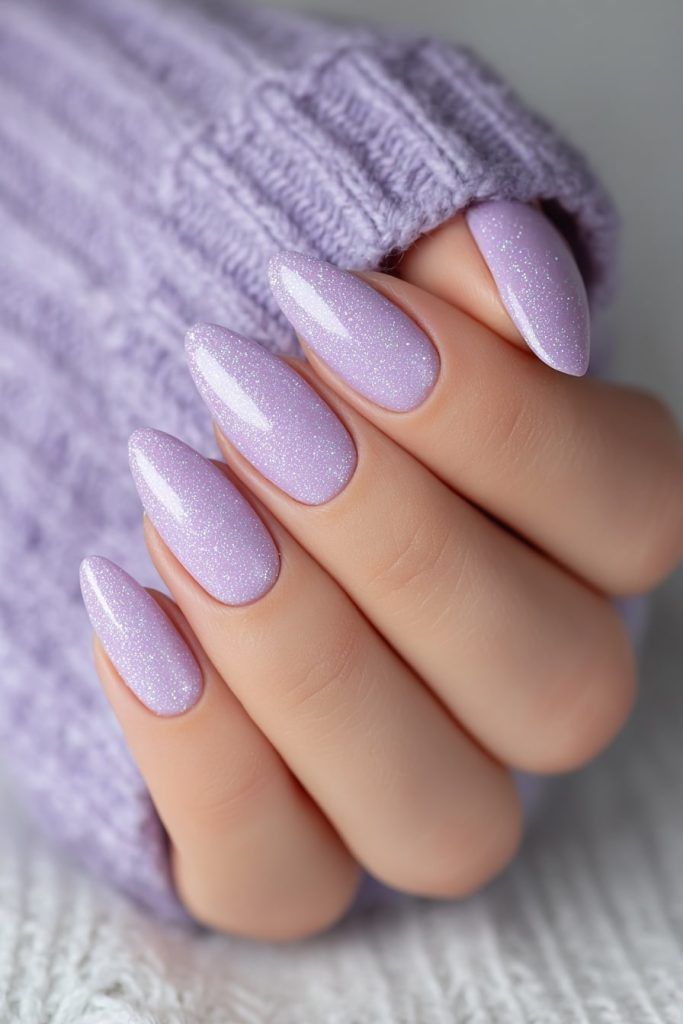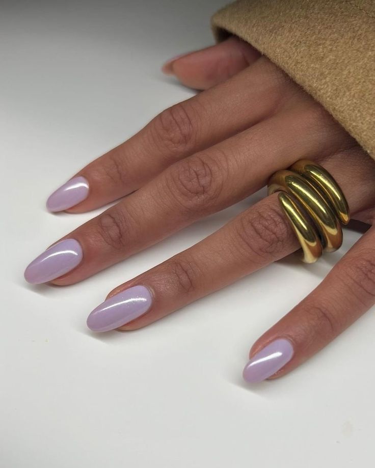 A smooth lilac shimmer polish coats almond-shaped nails for a simple yet radiant style. The design feels polished, soft, and effortlessly chic.