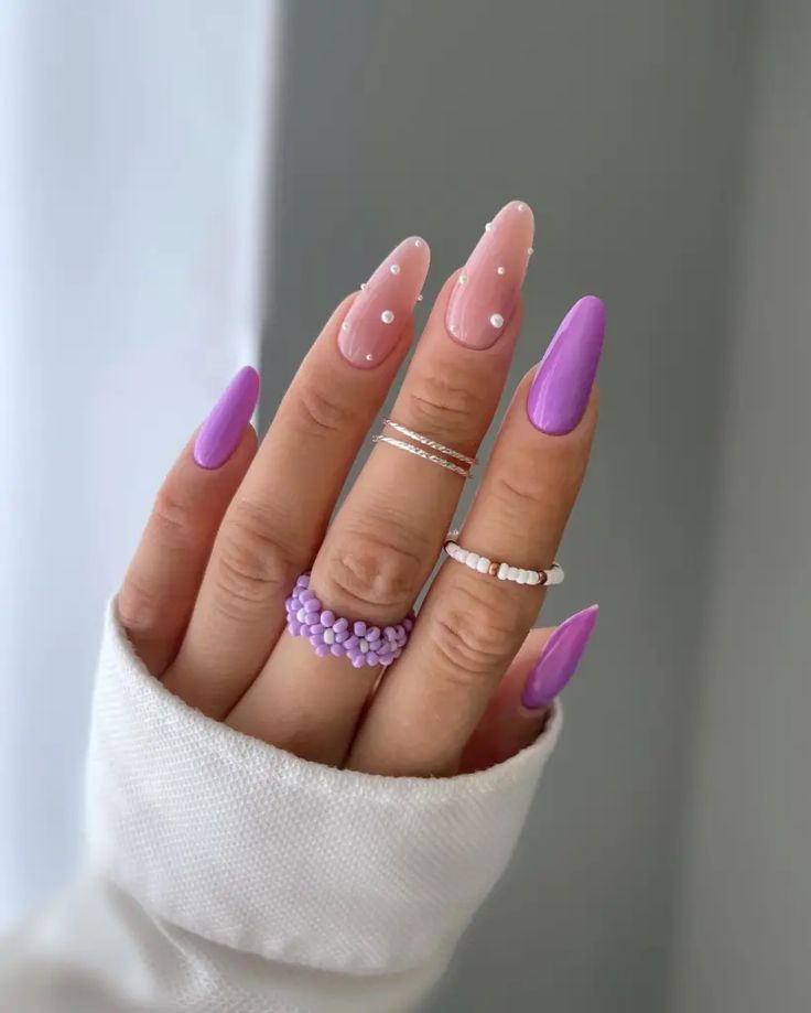 Bright lilac nails are paired with sheer pink accent nails dotted with tiny pearl details. The overall look is chic, glossy, and softly luxurious.